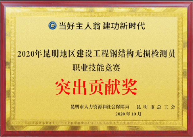 同時,我司作為技術支持單位協助云南省工程檢測協會舉辦了2020年昆明地區建設工程鋼結構無損檢測員職業技能競賽活動。此次技能競賽選拔出了一批技藝精湛、善于解決技術難題的技術尖兵,不僅使檢測機構有效地判斷自身鋼結構無損檢測的水平,取長補短,也促進昆明市地區建筑工程檢測行業鋼結構檢測整體水平的提升。在此次技能競賽活動中我司提供了大力支持、表現突出,因此獲得了由昆明市人力資源和社會保障局、昆明市總工會頒發的突出貢獻獎獎牌和榮譽證書。