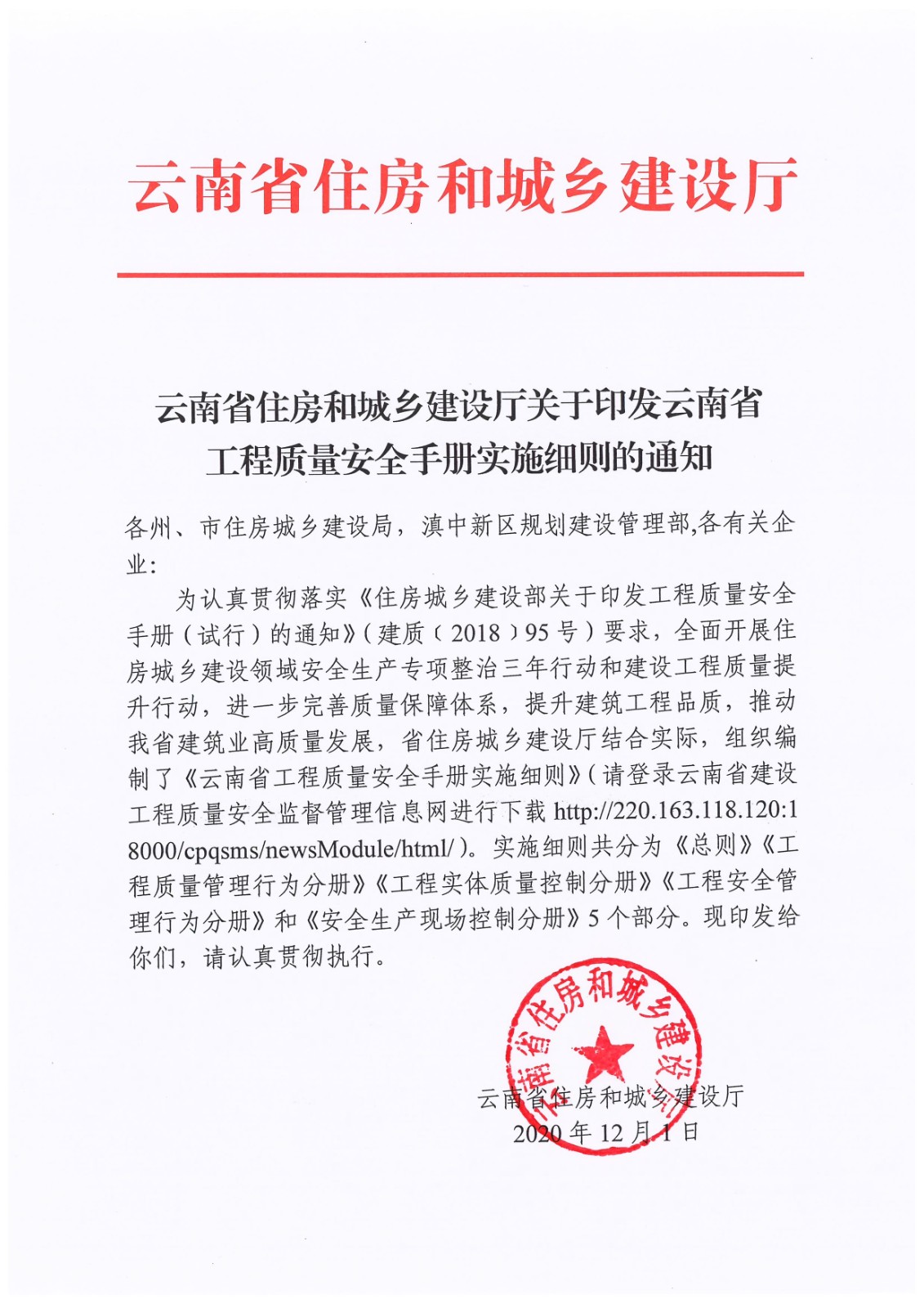 云南省住房和城鄉(xiāng)建設廳關(guān)于印發(fā)云南省工程質(zhì)量安全手冊實施細則的通知