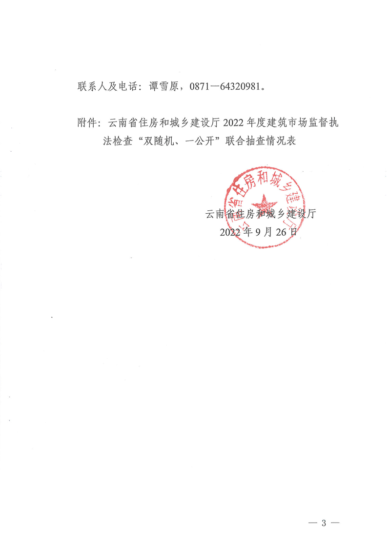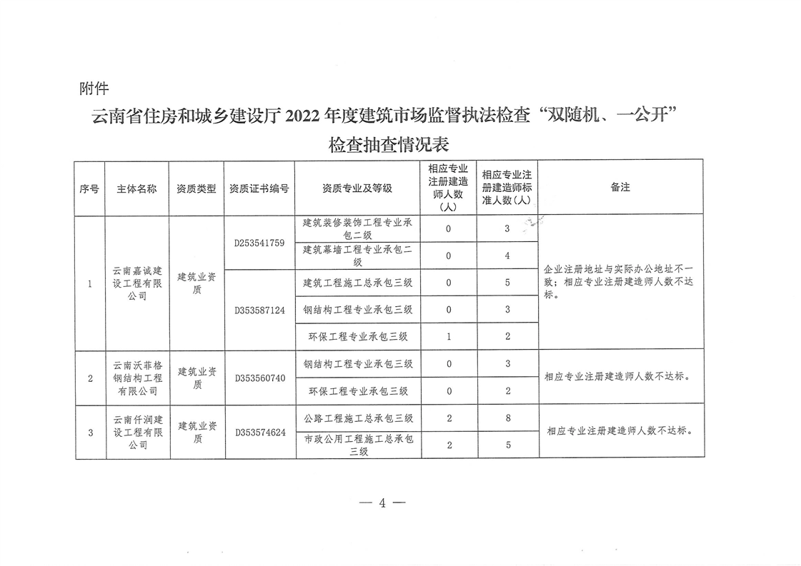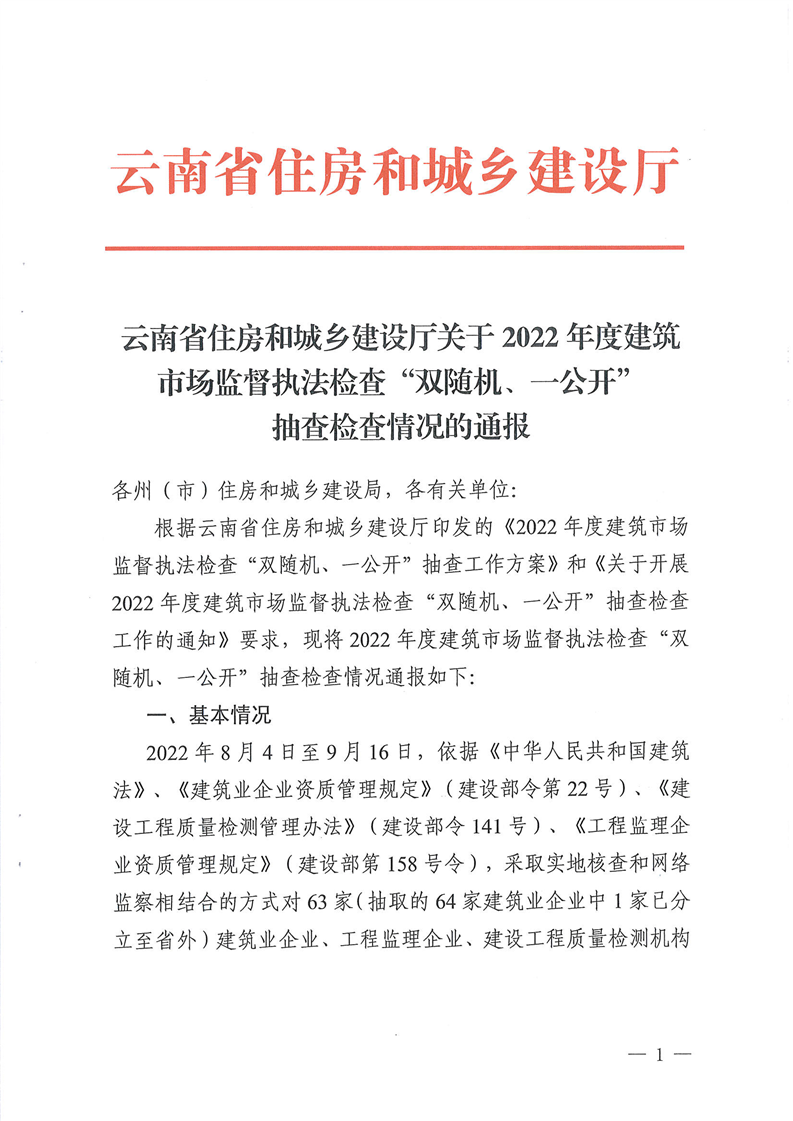 云南省住房和城鄉(xiāng)建設(shè)廳關(guān)于2022年度建筑市場(chǎng)監(jiān)督執(zhí)法檢查“雙隨機(jī)、一公開(kāi)”抽查檢查情況的通報(bào)