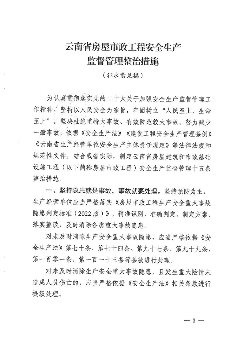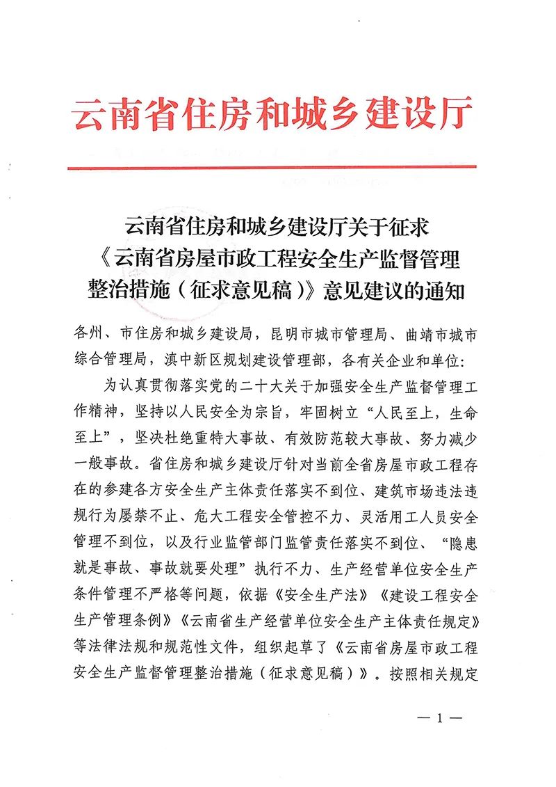 云南省住房和城鄉(xiāng)建設廳關于征求 《云南省房屋市政工程安全生產(chǎn)監(jiān)督管理整治措施(征求意見稿)》意見建議